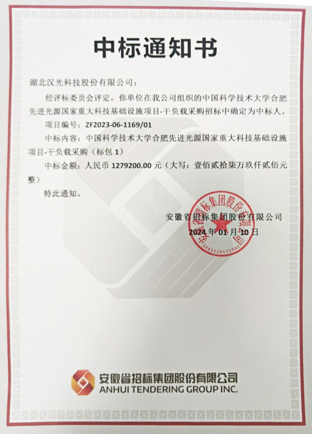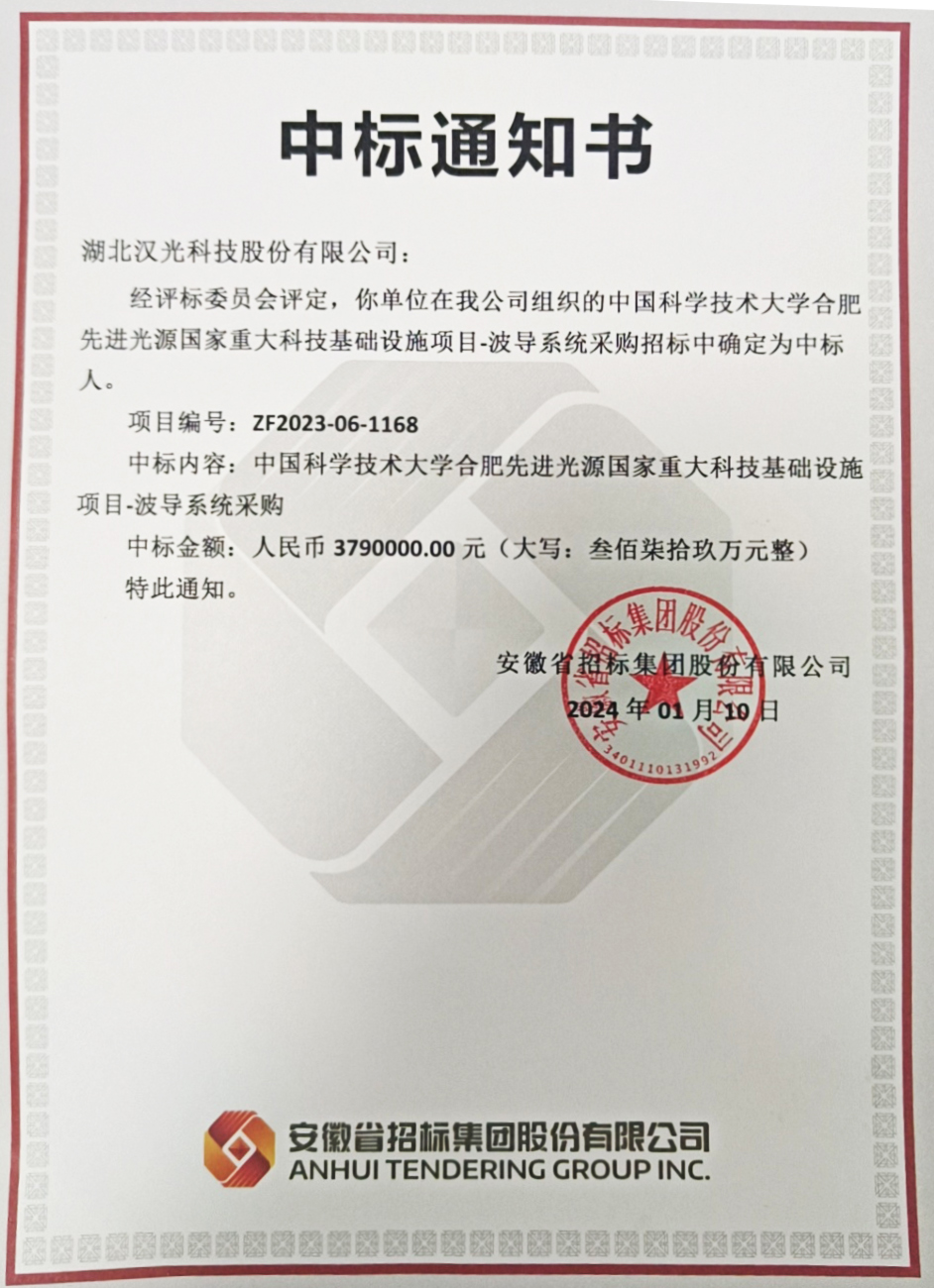 1月10日, 公司收到招標機構(gòu)安徽省招標集團有限公司發(fā)出的中標通知,公司自主研制的波導(dǎo)系統(tǒng)和干負載成功中標中國科學(xué)技術(shù)大學(xué)合肥先進光源國家重大科技基礎(chǔ)設(shè)施項目,中標總價500余萬元。此次中標,標志著我公司自主研制的波導(dǎo)系統(tǒng)和干負載在國家重大科技基礎(chǔ)設(shè)施中得到進一步廣泛應(yīng)用。