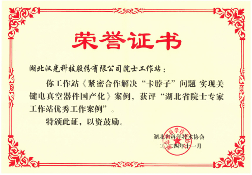 近日,公司收到了湖北省科學(xué)技術(shù)協(xié)會(huì)頒發(fā)的“榮譽(yù)證書”,公司院士工作站《緊密合作解決“卡脖子”問題 實(shí)現(xiàn)關(guān)鍵電真空器件國產(chǎn)化》案例獲評(píng)“湖北省院士專家工作站優(yōu)秀工作案例”。