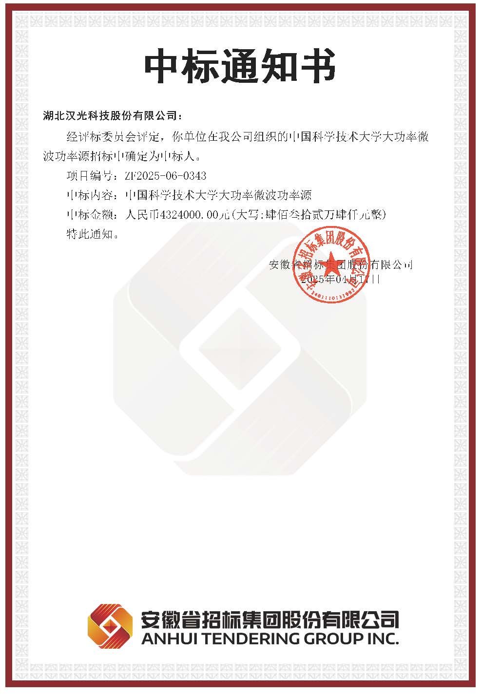 近日,公司收到安徽省招標集團股份有限公司發(fā)來的中標通知書,公司成功中標中國科學技術大學4套大功率微波功率源,中標金額總計432.4萬元。