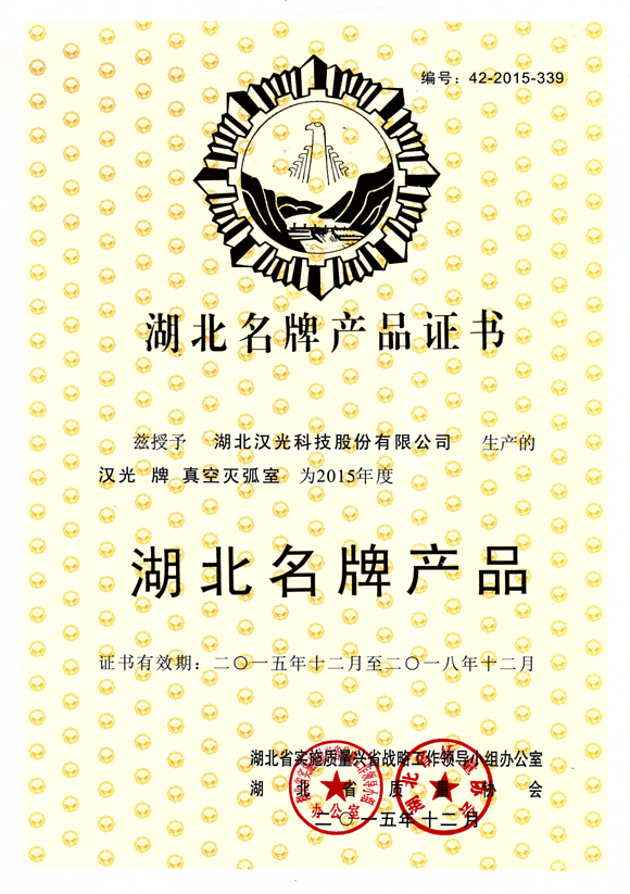 2015年12月30日,我公司生產(chǎn)的“漢光”牌真空滅弧室繼2012年之后,再次被湖北省實(shí)施質(zhì)量興省戰(zhàn)略工作領(lǐng)導(dǎo)小組辦公室、湖北省質(zhì)量協(xié)會(huì)評(píng)為2015年度湖北名牌產(chǎn)品。