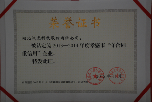 2016年3月2日,我公司獲得孝感市“守合同 重信用”企業(yè)榮譽稱號。該評選活動由孝感市工商行政管理局、孝感市企業(yè)信用促進會主辦。
