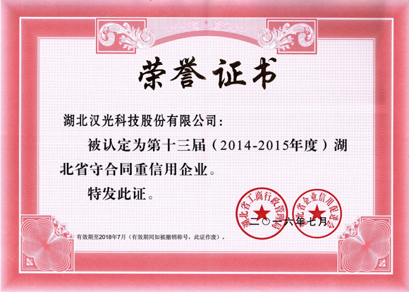 2016年7月19日,我公司榮獲第十三屆(2014-2015年度)湖北省“守合同重信用”企業(yè)榮譽稱號。該評選活動由省工商局、省企業(yè)信用促進(jìn)會舉辦。